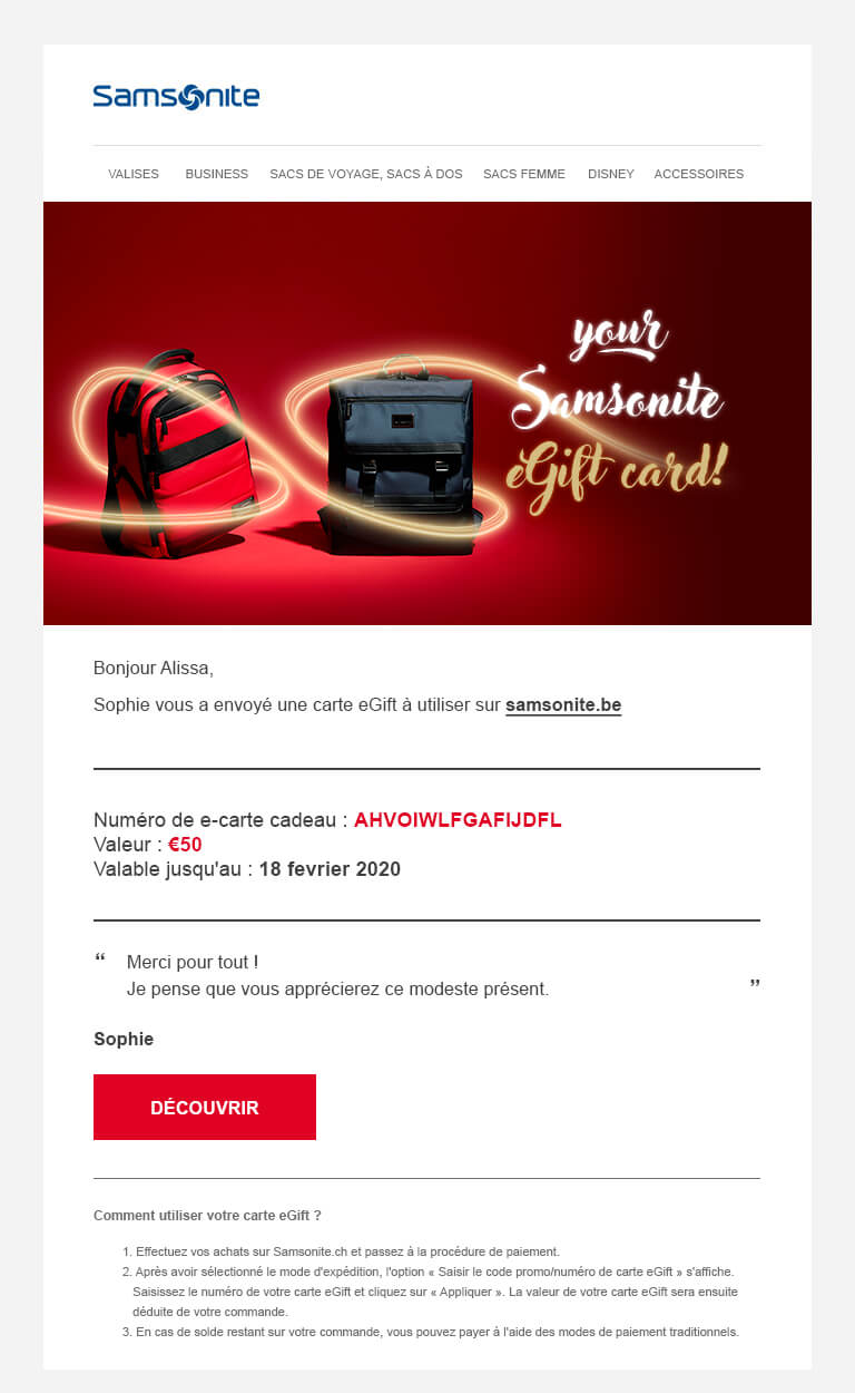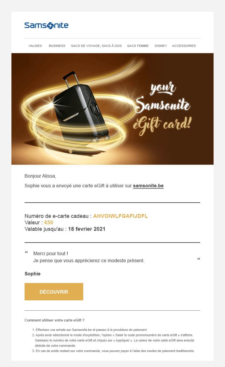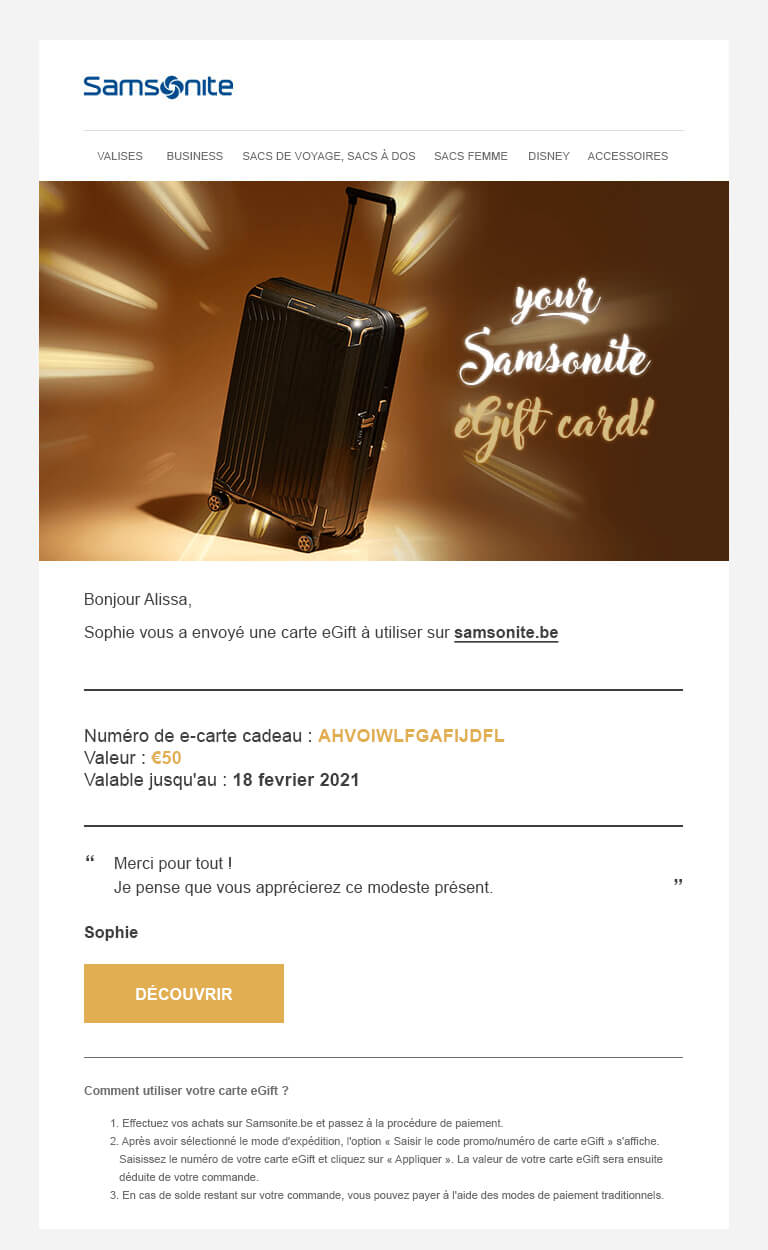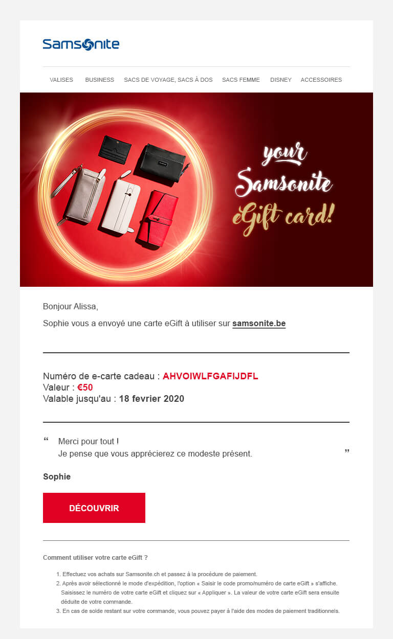 - Les eGift Cards sont disponibles en différents modèles et vous pouvez y joindre un message personnalisé. Samsonite n'assume aucune responsabilité quant au contenu de votre message personnel et se réserve le droit de ne pas intégrer votre message personnel dans l'eGift Card si celui-ci s'avère inapproprié.
