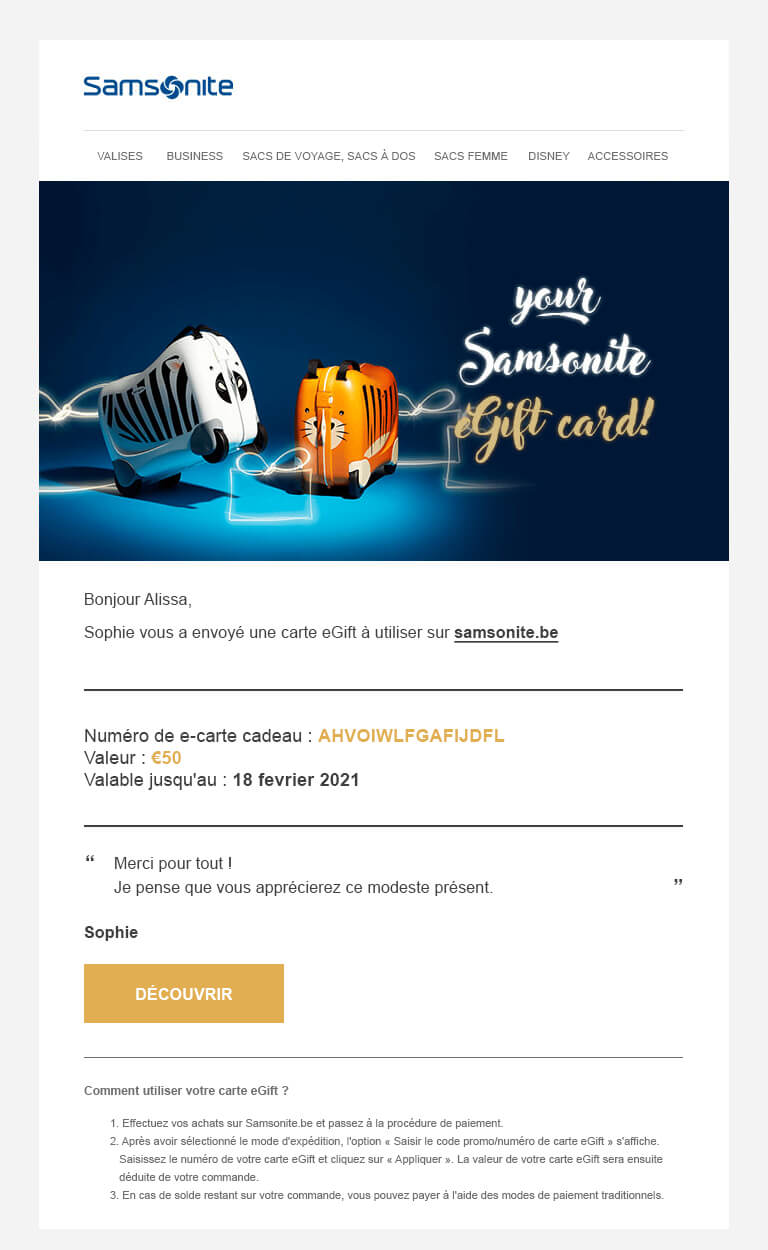 - Vous recevez les eGift Cards gratuitement par e-mail. Si une eGift Card a été commandée en même temps que d'autres produits Samsonite, elle sera envoyée séparément par e-mail.